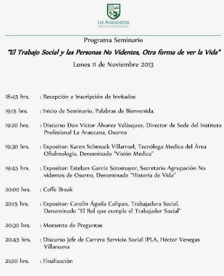 En Osorno este lunes 11 de noviembre se realizara un seminario denominado "El trabajo social y las personas no videntes, otra forma de ver la vida".
