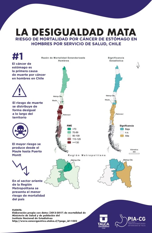 Investigadores de la Universidad de Talca y PIA-CG confirman que el riesgo de muerte se distribuye de forma desigual a lo largo del territorio, observándose un mayor riesgo desde el Maule hasta Puerto Montt. Por otra parte, el Servicio de Salud Metropolitano Oriente es el que refleja el menor riesgo de mortalidad por cáncer gástrico.