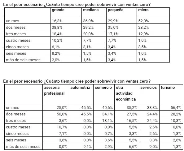 De las 453 empresas encuestadas un 85% espera que sus ventas caigan durante el primer semestre y un 45% cree que la baja será mayor a un 50%. Solo un 8% cree que este primer semestre será mejor que en igual perdido de 2019.En cuanto al tamaño de empresa claramente las más pequeñas son las más afectadas y as que esperan caídas más grandes en sus ventas, donde sobre un 40% espera caídas en el semestre superiores al 50%.