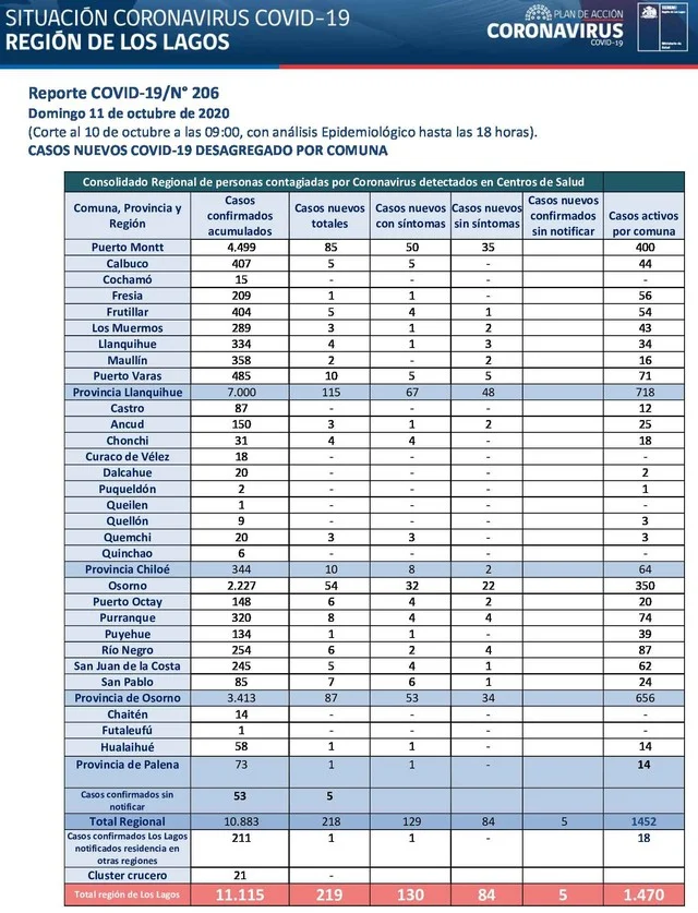 Casos de Covid-19 según el informe entregado por la Seremi de Salud de la Región de Los Lagos, al mediodía de este 11 de octubre, la provincia de Llanquihue registra 115 casos nuevos de Covid19, destacando Puerto Montt con 85.