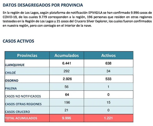 COVID19: Provincia de Osorno registra 61 nuevos casos, Comuna de Osorno 33