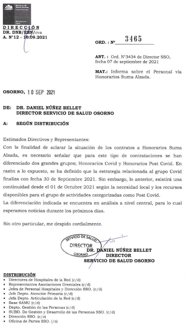 El Director del Servicio de Salud de Osorno, Dr. Daniel Núñez Bellet, aclara situación de los contratos a Honorarios Suma Alzada, a través de un comunicado.