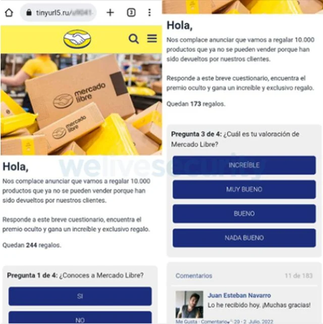 El engaño llega a las víctimas a través de un mensaje que muchas veces es enviado por un contacto conocido, algo común en los engaños que se distribuyen a través de WhatsApp. En este caso se hace referencia a un supuesto sorteo que realiza Mercado Libre de productos que fueron devueltos. Además, incluye un enlace oculto por un acortador que lleva a la potencial víctima a un sitio fraudulento que simula ser el sitio oficial de la popular plataforma de compra y venta de artículos.