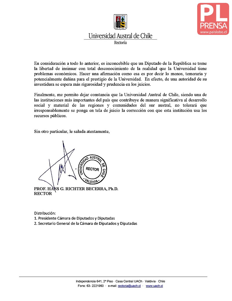 Compartimos con ustedes una carta del Rector de la Universidad Asutral de Chile, Dr. Hans Richter Becerra, en respuesta al Diputado de la República por el Distrito 26 de la Región de Los Lagos, Alejandro Bernales Maldonado, debido a los dichos efectuados este martes 30 de agosto por el parlamentario ante el pleno de la Cámara, en "Hora de Incidentes".