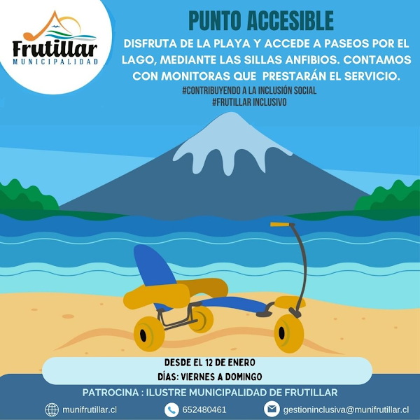 “Para acceder a la playa a través de las rampas hay tres estructuras emplazadas en Frutillar Bajo. Una frente a la calle O'Higgins, la otra frente a calle San Martín y la tercera frente a la escuela Bernardo Philippi. Las tres rampas tienen pasarelas que llegan hasta el lago. En tanto, el punto accesible está ubicado frente a la escuela Bernardo Philippi, en la playa, donde están los baños públicos”, dijo.