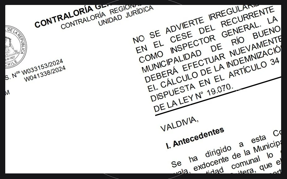 La Contraloría Regional de Los Ríos emitió un primer dictamen que reconocía el derecho de Tribiño a recibir una indemnización por los años de servicio prestados entre 2009 y mayo de 2024, fijando un máximo de 11 años de indemnización. No obstante, la Municipalidad de Río Bueno no habría cumplido con el pago de dicha compensación, aduciendo dificultades económicas y proponiendo pagar en cuotas, lo cual habría sido rechazado por la Contraloría, señala el abogado Barría.